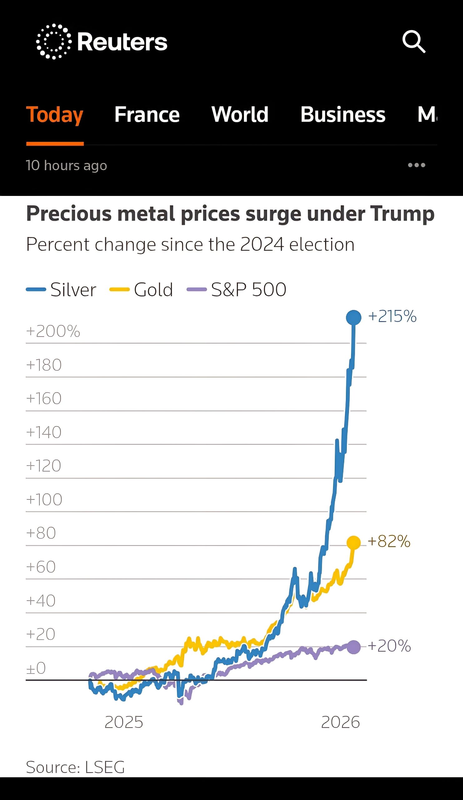 Un graphique publié par Reuters vendredi 23 janvier 2026 illustre une tendance notable. Depuis l’élection présidentielle américaine de 2024, et jusqu’à aujourd’hui, les prix des métaux précieux – particulièrement l’Argent et l’Or – ont connu une hausse tout à fait supérieure à celle du marché boursier traditionnel.