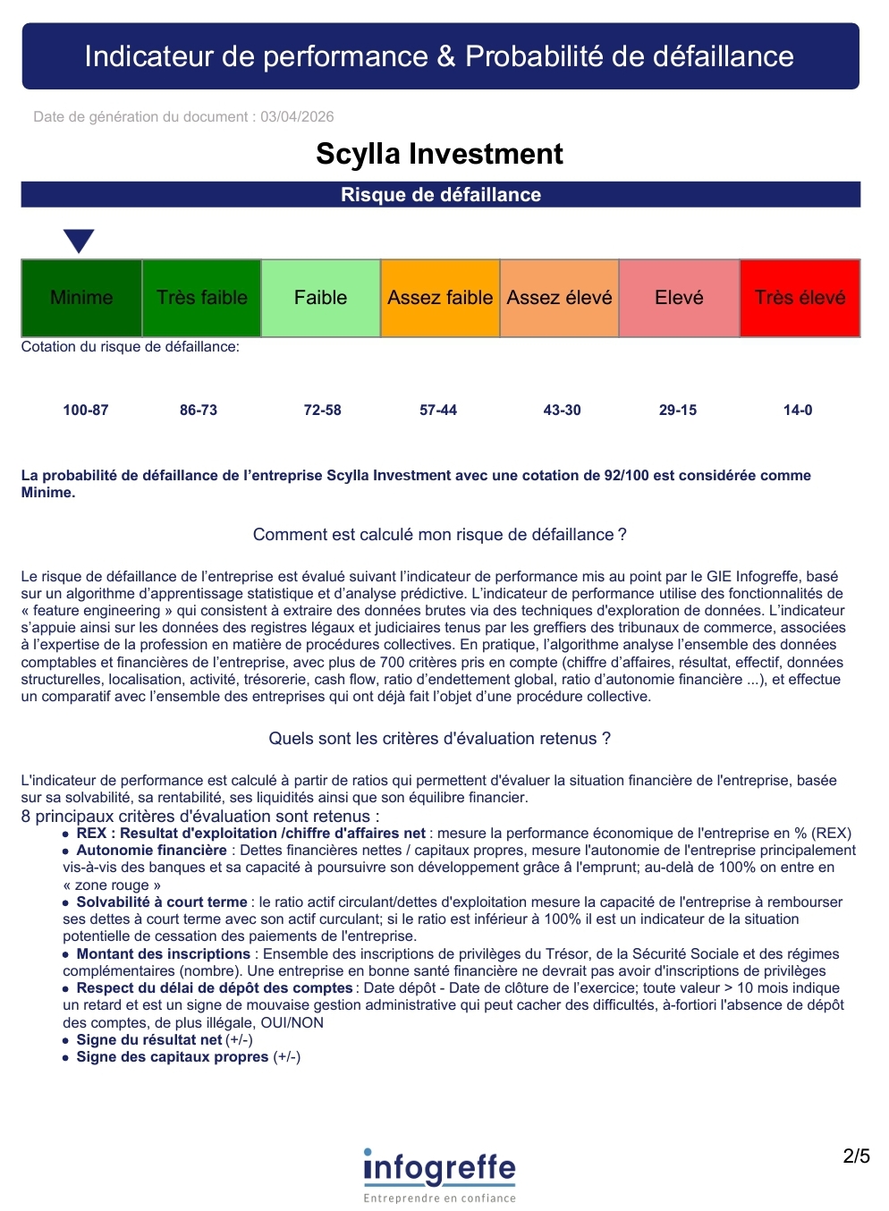 Basée sur un ensemble de 8 critères principaux – que sont le Résultat d’exploitation, l’Autonomie financière, la Solvabilité à court terme, le montant des inscriptions, le Respect du délai de dépôt des comptes, le Signe du résultat net ainsi que le Signe des capitaux propres – cette évaluation appelée « Indicateur de Performance & Probabilité de défaillance » fait état d’une notation de 92/100 concernant Scylla Investment au 03 avril 2026 (donc toujours supérieure à 87/100).